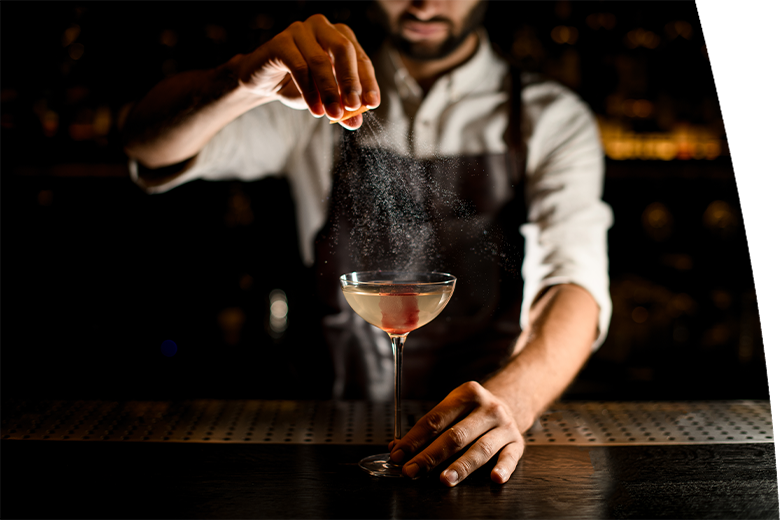There are no limits to your imagination, but it's a good idea to base it on the flavours of the drink. If your drink contains lime juice, for example, then garnish it with lime slices.For an espresso martini, for example, you can put a few coffee beans on top of the foam. You can rub the rim of a tequila margarita glass with sweet juice and dip in salt. The drink not only looks good, it tastes better too. Take extra care on the appearance, if the drink looks luxurious and original, there is a big chance that your customers will take pictures and add it to social networks.